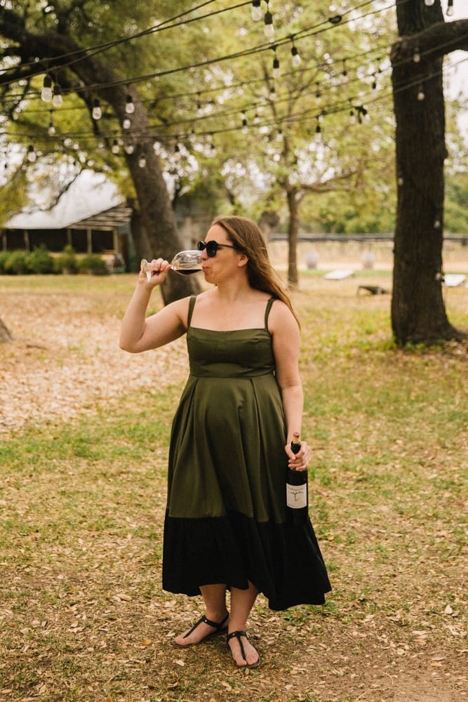 Look how cute my friend is!! This is what she wore while wine tasting Texas. It’s a sweetheart midi dress in dark green and black. She has a more preppy/classic style compared to me and I love showcasing other people’s sense of fashion in these guides.