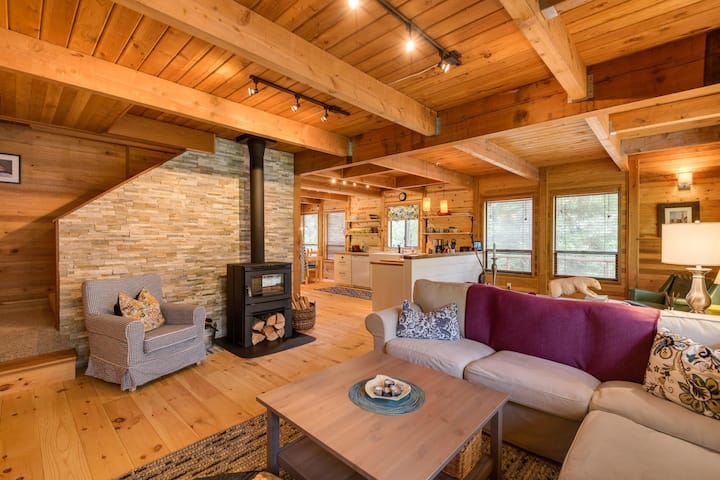 This Architectural Digest–featured cabin hangs right over the Wenatchee River with floor-to-ceiling windows and a retractable wall for indoor-outdoor living. It has three bedrooms (two kings and a queen), two bathrooms, and a sleek kitchen, all just two minutes from downtown Leavenworth. Guests love the cliffside deck with heat lamps, cozy fireplace, and the unbeatable river and mountain views year-round.
