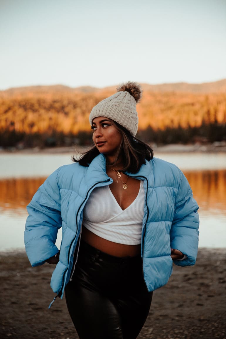 Recently I wore this blue puffer jacket around Yosemite and can’t wait to wear it on my Christmas trip to Idaho soon. A solid puffer needs to be on every winter cabin packing list. They’re warm, comfy, easy to throw on and can be worn on winter hikes, out to dinner or lounging around the cabin. I love puffers compared to North Face jackets.